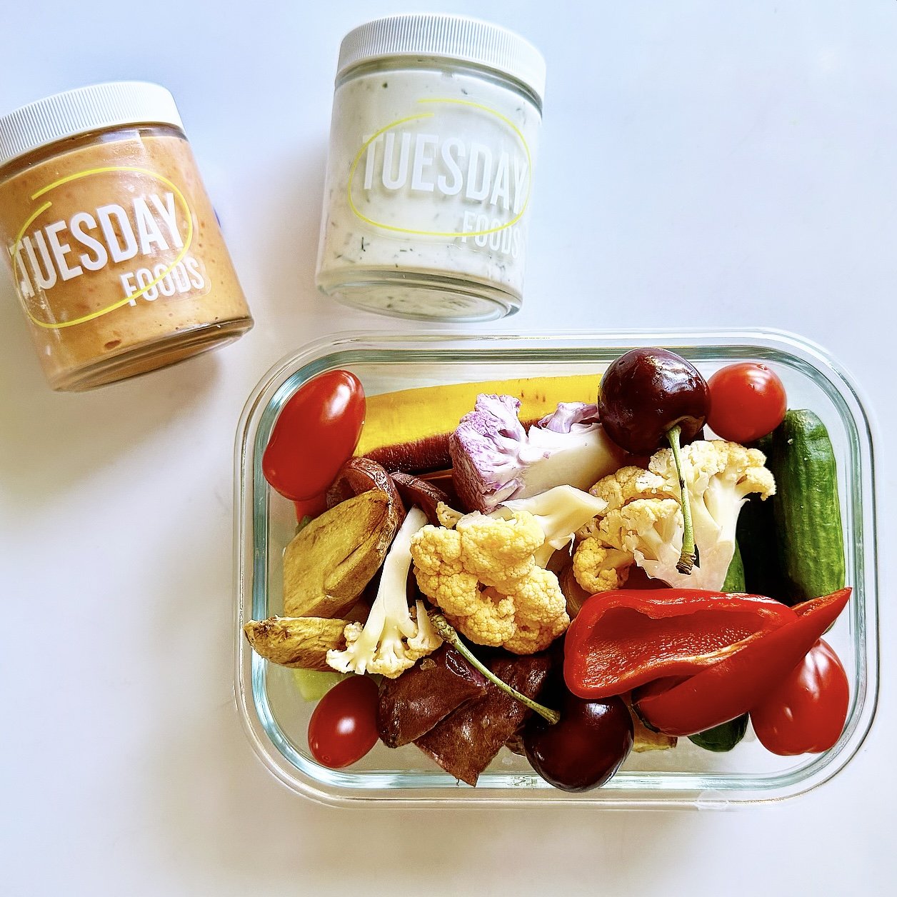 Tzatziki is a cucumber and yogurt-based sauce or dip commonly served in Mediterranean cuisine. Our plant-based version is herbaceous, cool and creamy, but made without the dairy! This would make the perfect dip for fresh vegetables and warm pita, served with olives. Pairs with our Mediterranean Bowl this week.