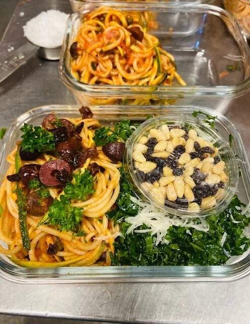 This gluten free pasta and zucchini noodle dish really has it going on in the flavor department. Savory and sweet, spicy and bold, pasta puttanesca packs a punch that will make your taste buds salivate with each delicious bite. We have paired it with our version of an Aspen local’s favorite…..LuLu Wilson Kale Salad, served on the side topped with currants and pine nuts.