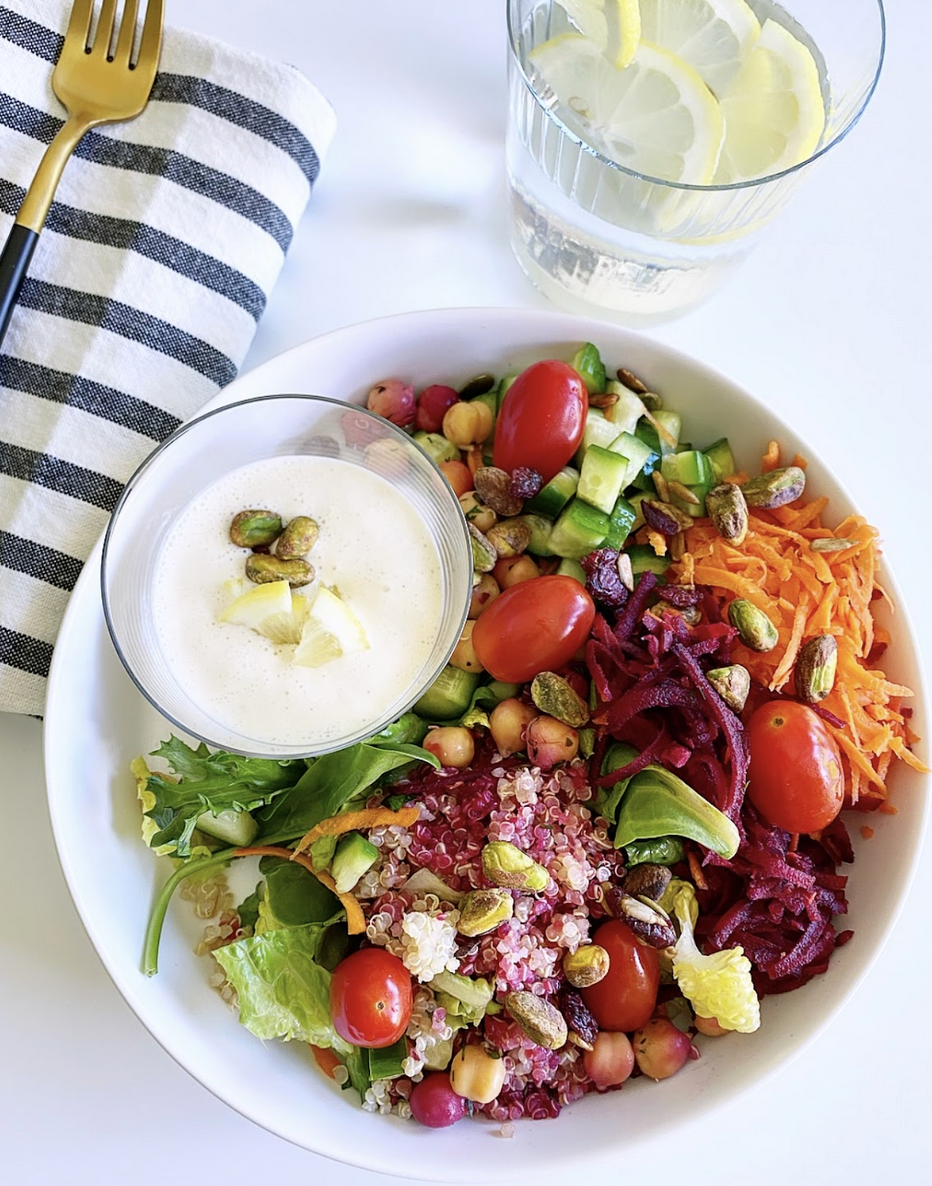 This salad is all about using what's fresh and in season from your local market, and this week it's loaded with plant-based protein to keep you energized all day long. Quinoa, chickpeas, grated carrots and beets, crisp cucumbers, mixed spring greens, beautiful cherry tomatoes, and our homemade basil vinaigrette.